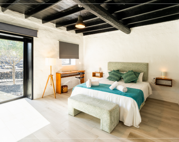 La suite Sol ofrece comodidad y tranquilidad, con cama 140×190 cm, terraza privada, Smart TV y baño completo con ducha y doble lavamanos, perfectas para una escapada relajante en La Geria, Lanzarote.
